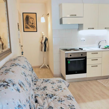 Soggiorno con angolo cottura attrezzato di tutto, camera matrimoniale, bagno, e dotato di Smart TV, Wi-Fi, lavatrice, teli mare, aria condizionata, biancheria, set di cortesia.